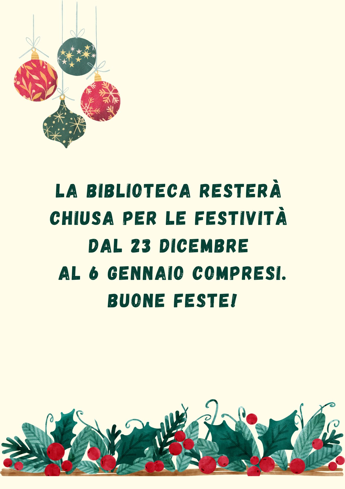 Si avvisa che la biblioteca resterà chiusa per le festività natalizie dal 23 dicembre al 6 gennaio compresi.